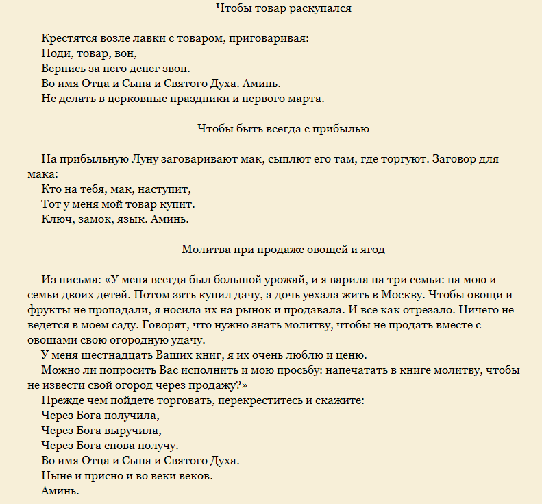 «Як неміряно в моїх руках маковинок, стільки і покупців буде у мого справи. Всі люди, які на розсип маку настануть, обов’язково у мене щось куплять. Товар на гроші поміняю, Бога завжди прославляю! Амінь!»