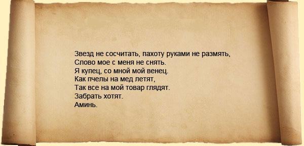 «Бджоли по лузі летіли, мед для мене збирали. Я його в воду поклала. Як люди мед їдять, так і нехай на мій товар дивляться, придбати хочуть. Мені в прибуток торгувати, швидко збути товар і купити новий! Поріг солодкою водичкою обмиваю, магазин від поганих людей захищаю. Амінь!»