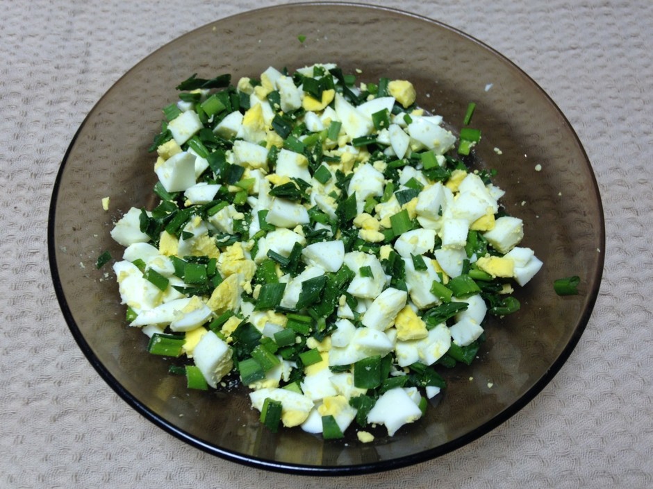 • Пір’я зеленої цибулі і варені яйця дрібно шаткуємо. Трохи підсолюємо.