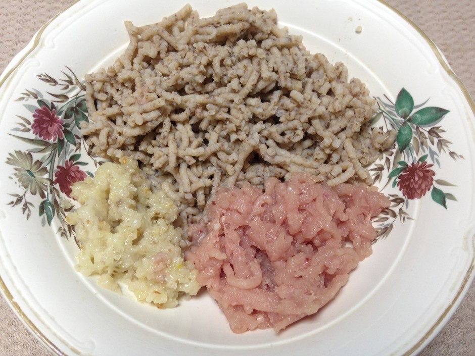 • Гречку, філе курки і пасеровану цибулю перекручуємо. З’єднуємо з сирим яйцем, вершками. Присаливаем і злегка перчимо