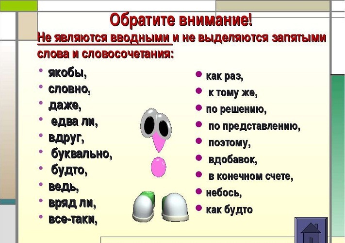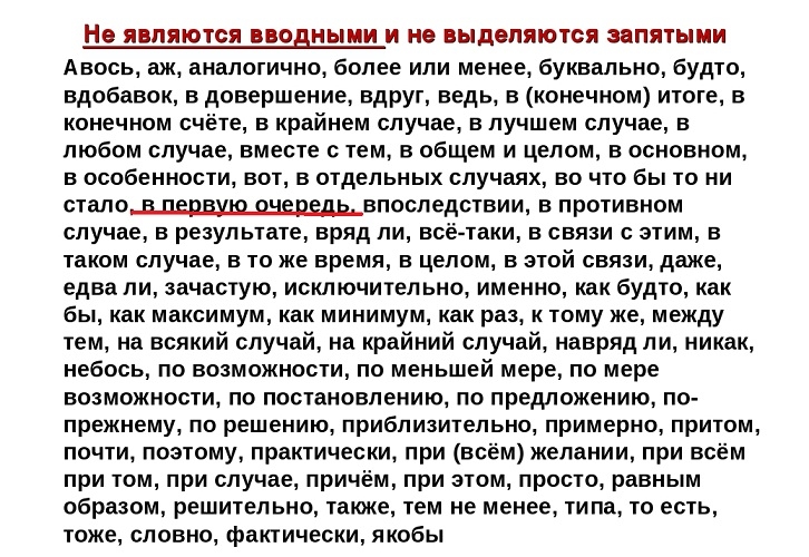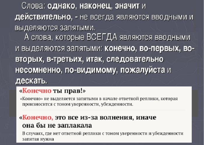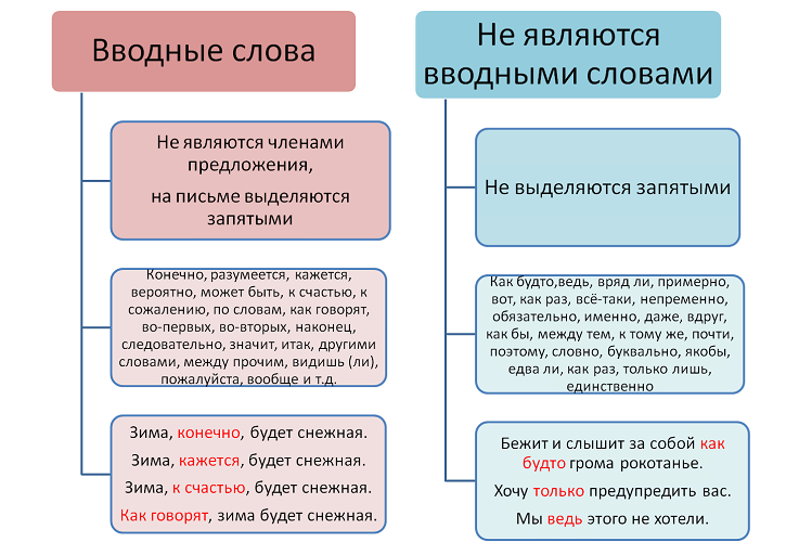 Ввідні слова просто викинути з тексту без втрати сенсу або переставити в іншу частину пропозиції. Завдяки таким конструкціям говорить об’єкт в тексті виражає модальність, своє ставлення до сказаного. Ввідні слова і словосполучення є частиною пропозиції. Але з його головними членами не складаються в синтаксичному «спорідненість». Тому часом відбувається плутанина між правильною розстановкою ком між ними.